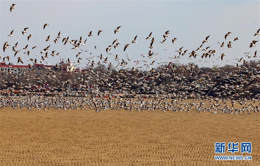 4月4日,一群候鳥在秦皇島市沿海濕地飛翔。近日,大批候鳥飛抵河北省秦皇島市沿海濕地,出現(xiàn)“萬鳥臨?!逼嬗^。秦皇島沿海濕地鳥類食物豐富,每年春、秋兩季,大批候鳥遷徙經(jīng)過這里。新華社記者 楊世堯 攝