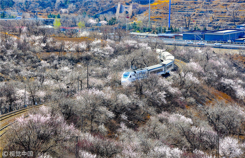 2019年3月22日,北京居庸關(guān)附近的山花盛開,S2線列車穿行在花海之中,構(gòu)成一幅美麗的畫面。