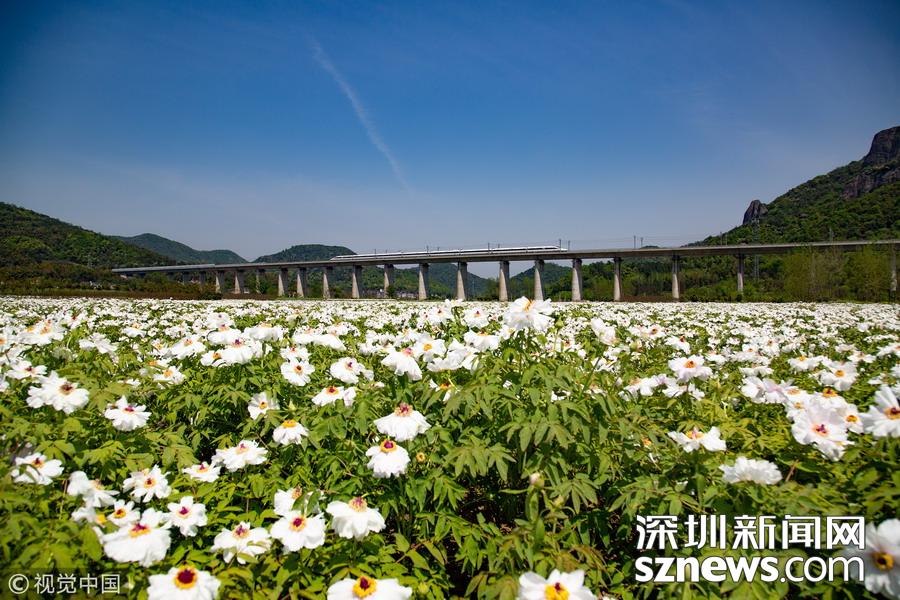 2019年4月8日,一列高鐵列車(chē)從京福高鐵安徽銅陵段一片盛開(kāi)的鳳丹花海中駛過(guò)。隨著氣溫回升,安徽省銅陵市境內(nèi)的鳳丹競(jìng)相綻放,高鐵列車(chē)穿行其間,成為春日里一道美麗的風(fēng)景線。