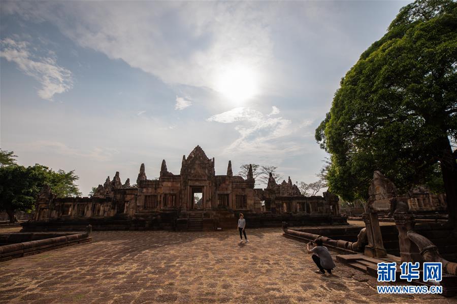 4月5日,游客參觀泰國武里南府低城寺。 一年一度的“登帕儂隆山節(jié)”在泰國東北部毗鄰柬埔寨的武里南府帕儂隆山舉辦。當?shù)厝艘怨叛b巡游展示獨特的傳統(tǒng)文化,希望能吸引更多外國游客、促進當?shù)芈糜螛I(yè)發(fā)展。 新華社記者 張可任 攝
