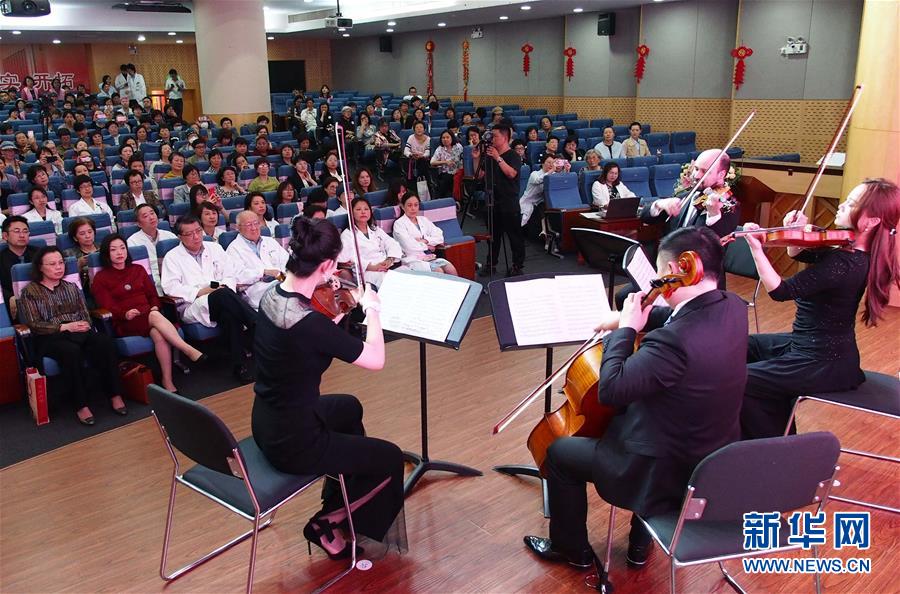4月25日,上海交響樂團的藝術(shù)家在復(fù)旦大學(xué)附屬腫瘤醫(yī)院為患者和醫(yī)護人員演奏。 當(dāng)日,第一場“全城交響·上交為你而來”音樂會在復(fù)旦大學(xué)附屬腫瘤醫(yī)院報告廳奏響,為患者及醫(yī)護人員獻(xiàn)上一場專屬音樂會?!叭墙豁憽ど辖粸槟愣鴣怼笔巧虾=豁憳穲F2019年向全上海的機構(gòu)及個人開放的公益演出項目。 新華社記者 任瓏 攝