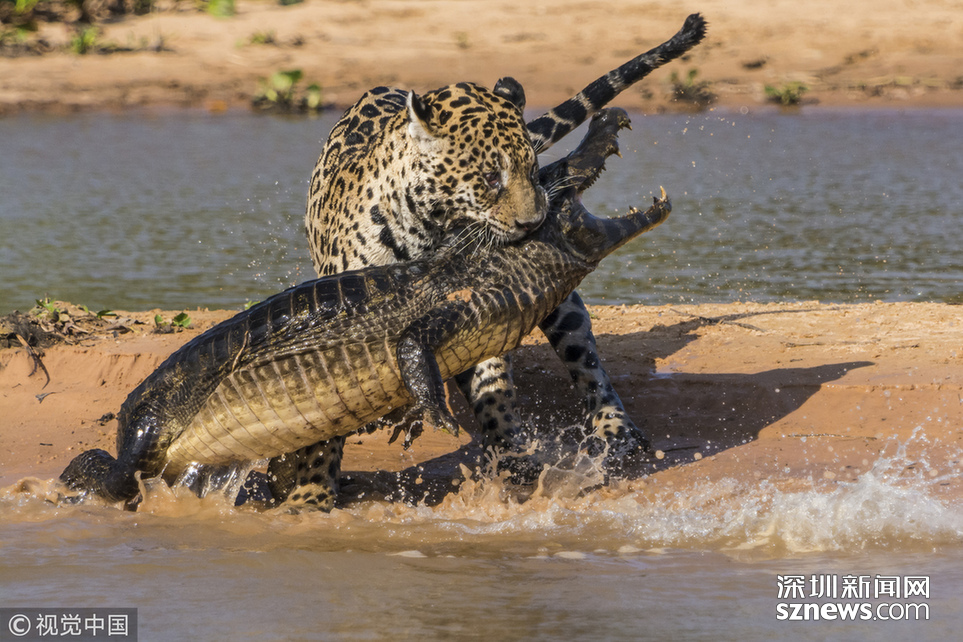 當(dāng)?shù)貢r(shí)間2013年8月25日,巴西潘特納爾,一頭雄性美洲豹攻擊了一條巴拉圭凱門鱷并與之纏斗。這只美洲豹預(yù)先躲在水中匍匐前進(jìn),然后突然出現(xiàn)把這只鱷魚(yú)震住,隨后用牙刺進(jìn)鱷魚(yú)的堅(jiān)硬的外殼中,將其拖入?yún)擦帧?/p>