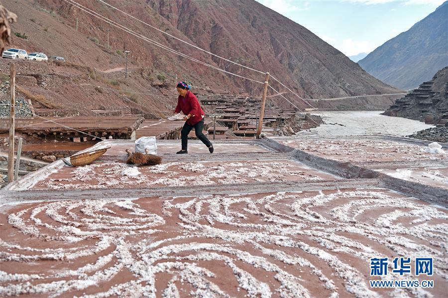 5月22日,西藏納西民族鄉(xiāng)加達村村民拉措在鹽田上收鹽。位于西藏昌都芒康縣瀾滄江畔的古鹽田,至今仍保持最原始的手工曬鹽方式。據(jù)史料記載,唐朝時期當(dāng)?shù)鼐烷_始曬鹽。鹽田在瀾滄江兩岸依山而建,由多根木柱搭架,架上用透水性強的泥土鋪成平面夯實,當(dāng)?shù)鼐用駨臑憸娼系柠}井、鹽池中取出鹵水倒入鹽田,經(jīng)陽光蒸曬、風(fēng)干,結(jié)晶成鹽。遠遠望去,鹽田錯落有致,田中鹵水宛若鏡面,形成壯麗奇觀。新華社記者李鑫 攝