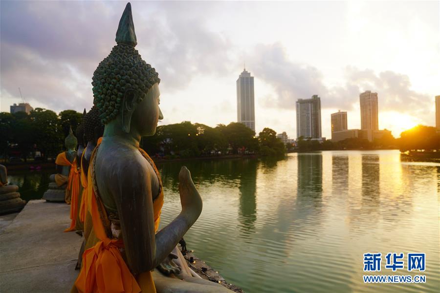 這是夕陽下的斯里蘭卡科倫坡水中廟佛像(5月27日攝)。 在科倫坡貝拉湖上有一座木造樓閣——水中廟。木造建筑上面覆蓋著藍(lán)瓦,外圍環(huán)繞著線條優(yōu)美的佛像。樓閣外高臺上供奉的佛像,與不遠(yuǎn)處的高層建筑相互映照。祥和寧靜的水中廟已成為人們修心、祈福的重要場所。 新華社記者唐璐攝