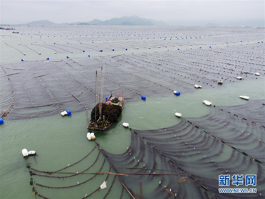 4月10日,霞浦縣長(zhǎng)春鎮(zhèn)海域,海帶養(yǎng)殖戶在用船只收獲海帶(無(wú)人機(jī)拍攝)。近日,福建省寧德市霞浦縣30余萬(wàn)畝養(yǎng)殖海帶進(jìn)入收獲季節(jié),當(dāng)?shù)仞B(yǎng)殖戶搶抓晴好天氣,收獲海帶。海帶養(yǎng)殖是霞浦縣群眾增收致富的支柱產(chǎn)業(yè)。2018年該縣海帶產(chǎn)量14萬(wàn)余噸。新華社記者 姜克紅 攝