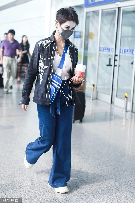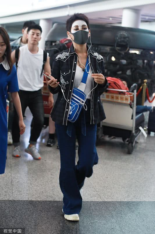 2019年6月19日,北京,寧靜現(xiàn)身機(jī)場。她穿敷面膜亮相短發(fā)干練個(gè)性灑脫,戴口罩對鏡揮手大方任拍。