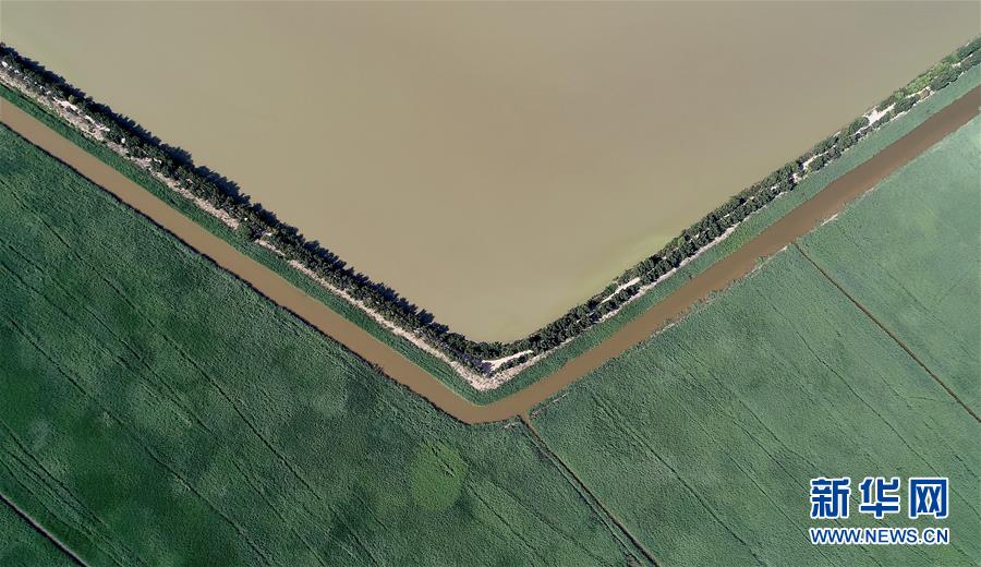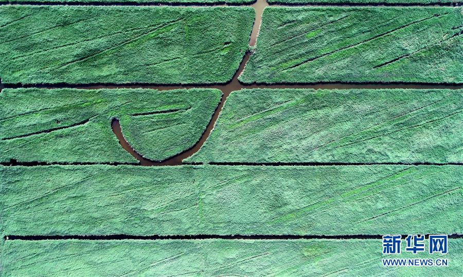 這是天津市寧河區(qū)七里海濕地內(nèi)蘆葦和水面形成的圖案(6月22日無(wú)人機(jī)拍攝)。