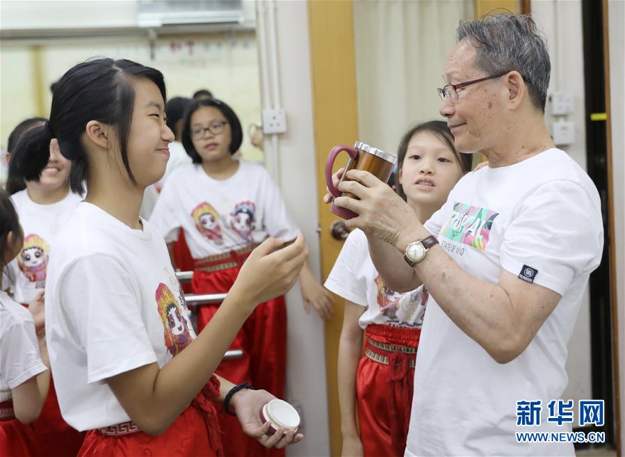 孩子們給79歲的粵劇名伶楊劍華敬茶(6月8日攝)。 聲輝粵劇推廣協會成立于2003年,是香港重要粵劇藝術團體之一,致力于向青少年推廣粵劇。協會目前有兩個初班,3個中班,一個青少年班?;泟∮址Q“廣東大戲”,表演技藝包括“唱做念打”,即唱功、身段、臺詞、武打,主要流行于廣東、廣西和香港、澳門等地區(qū)。2009年,粵劇被列入聯合國教科文組織人類非物質文化遺產代表作名錄,今年正逢十周年。 新華社記者 吳曉初 攝