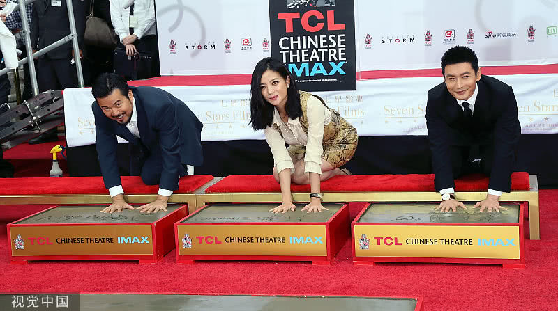 趙薇和黃曉明在好萊塢TCL中國大劇院門前按下象征世界電影人無上榮譽(yù)的手印,在該地留印的華人明星只有三個(gè),分別是成龍、吳宇森和馮小剛。