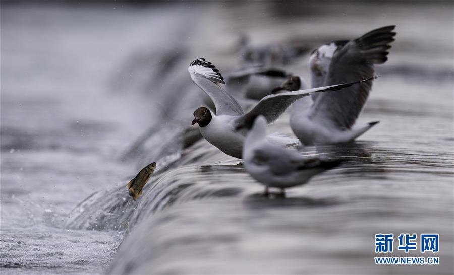 7月6日,在青海省剛察縣沙柳河里,幾只棕頭鷗在等待捕捉躍起的湟魚(yú)。 新華社記者 費(fèi)茂華攝