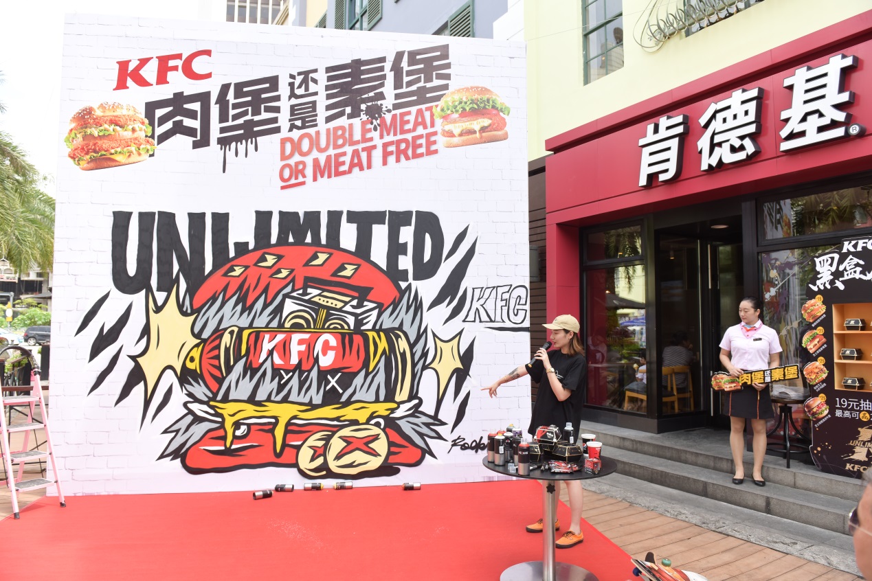 “肯德基是我非常喜歡的品牌,新潮、時(shí)尚。這一次與KFC的涂鴉合作,我在漢堡涂鴉的畫面中融入了像滑板、打碟機(jī)這樣的潮流元素,來演繹KFC厚菇堡這一款極具創(chuàng)新性的漢堡。用噴漆罐表現(xiàn)一整塊芝士厚菇,一口咬下能噴出濃郁的芝士;火焰燃燒的造型代表漢堡中肆意的醬汁,增加視覺沖擊感,呈現(xiàn)出一個沒有肉,但很real的霸氣素漢堡。”談及創(chuàng)作理念,ROCKLEE說道,“這種結(jié)合我覺得很有意義,一方面展現(xiàn)了涂鴉這種街頭文化多元的一面,另一方面也傳遞出KFC在漢堡界young OG的全新形象?!睆膭?chuàng)作到完工,整個過程都引來路人圍觀、拍照。從朋友圈看到消息的潮人又不斷向此聚集、花式打卡。