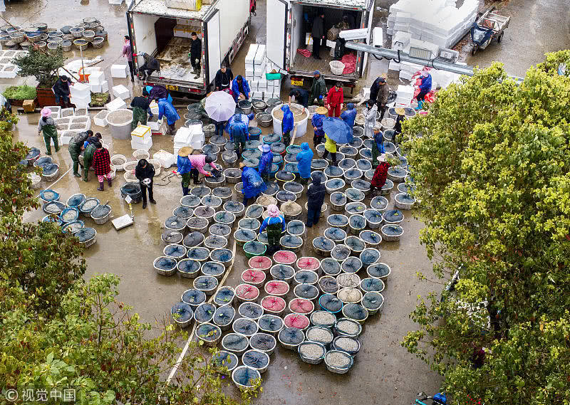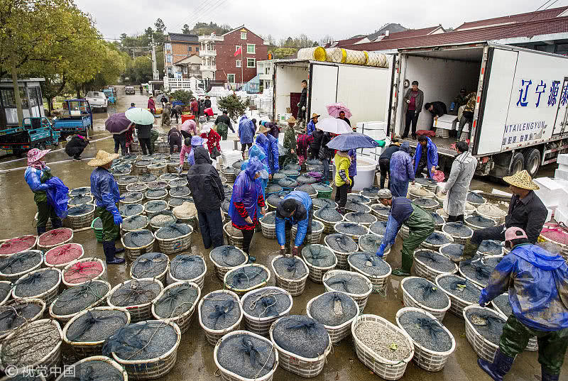 浙江臺(tái)州,三門(mén)縣花橋鎮(zhèn)柵下村的文化禮堂前,村民們冒雨和商販交易蟶苗,現(xiàn)場(chǎng)一片繁忙。據(jù)了解,花橋蟶苗屬于野生苗,存活率高,易成長(zhǎng),極受市場(chǎng)歡迎,一到捕撈季節(jié),遼寧、山東、江蘇和浙江的養(yǎng)殖戶和蟶苗小販爭(zhēng)相到花橋購(gòu)買優(yōu)質(zhì)蟶苗。