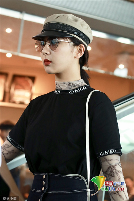 2019年7月25日,北京,楊紫現(xiàn)身機場。她穿黑色短T配牛仔裙變時髦女郎,戴報童帽架墨鏡”港風女sir“即視感,人氣爆棚。