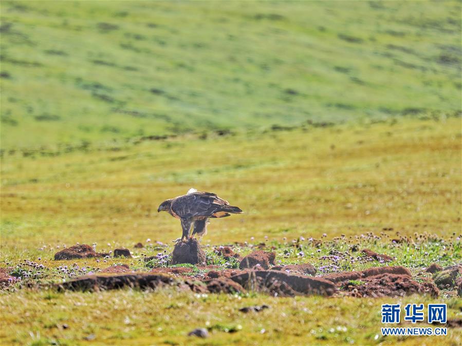 一只大鵟準(zhǔn)備享用捕獲的獵物(8月14日攝)。 8月12日至14日,來自全國(guó)各地的31名自然愛好者聚集在海拔4200米的青海省玉樹藏族自治州稱多縣嘉塘草原,參加“2019嘉塘自然觀察節(jié)”。自然愛好者用獨(dú)特視角記錄珍稀野生動(dòng)植物,觀察三江源生態(tài)。 新華社記者 張大川 攝
