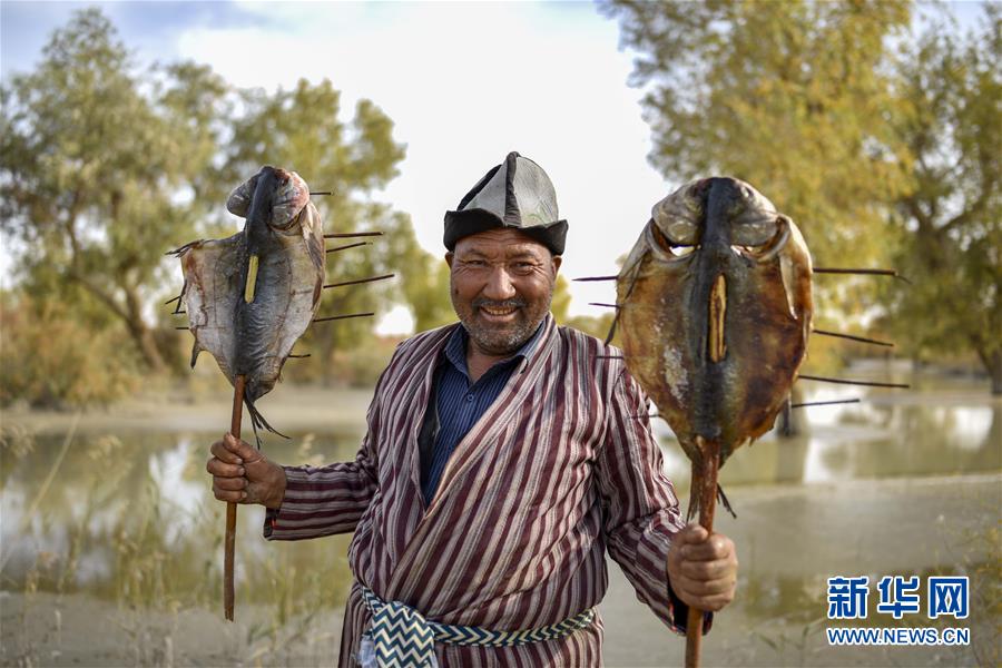 在羅布人村寨里,阿木東·艾不東展示自己制作好的羅布烤魚(2018年10月16日攝)。