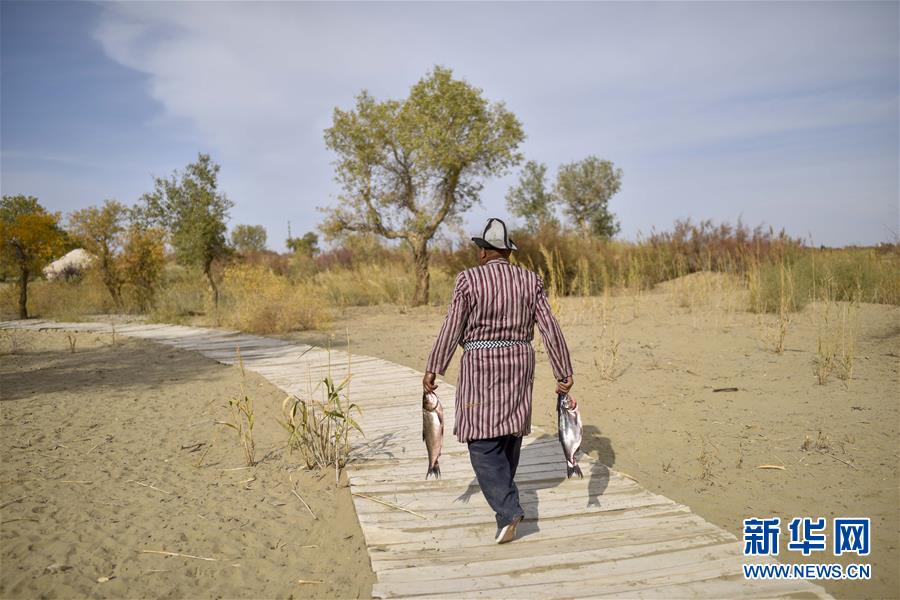 在羅布人村寨,阿木東·艾不東拎著兩條洗好的魚準(zhǔn)備制作羅布烤魚(2018年10月16日攝)。新華社記者 趙戈 攝