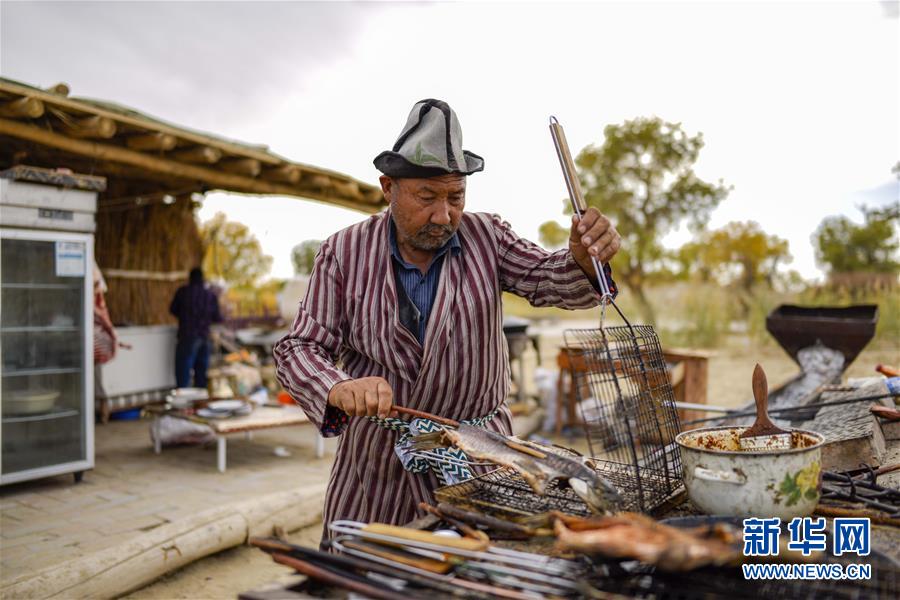 羅布人村寨位于新疆巴音郭楞蒙古自治州尉犁縣,塔里木河從這里流過(guò),沙漠、胡楊、湖泊的奇妙組合吸引了不少游客。生活在這里的羅布人阿木東·艾不東更成為大家關(guān)注的焦點(diǎn)。 阿木東·艾不東61歲,聲音洪亮,面色紅潤(rùn),平時(shí)喜歡穿著羅布麻紡織而成的對(duì)襟長(zhǎng)袍和羊毛氈制成的船形帽子,這是羅布人的傳統(tǒng)裝扮。 如今,許多羅布人不再以打魚為生,他們有的放牧,有的種植,有的開設(shè)店鋪……像阿木東一樣在沙漠中漁獵的羅布人已經(jīng)很少了。 制作羅布人傳統(tǒng)美食——紅柳烤魚是阿木東的拿手絕活。一根紅柳,穿起一條野魚,起一堆炭火,撒少許鹽巴,就可以靜待皮焦肉嫩的紅柳烤魚了。除了傳統(tǒng)口味外,阿木東對(duì)羅布烤魚進(jìn)行了改良?!拔颐刂屏艘环N烤魚醬,里面除了辣椒、鹽巴、孜然,還有其他佐料?!碑?dāng)問(wèn)起具體是哪些配方時(shí),阿木東笑著說(shuō):“還有就是塔里木河的味道!” 阿木東是一個(gè)閑不住的人。旅游旺季過(guò)后,他會(huì)制作卡盆(胡楊制作的獨(dú)木舟)模型、胡楊筆筒等,等旺季來(lái)臨再把這些小物件賣出去。 兩千年前,塔里木河與孔雀河載著天山、昆侖山的雪水,把羅布泊充盈得煙波浩渺。羅布人靠羅布泊水域和周圍的濕地及原始胡楊林繁衍生息。后來(lái),塔里木河下游河床被風(fēng)沙淤塞,干旱斷絕了綠色。2001年,塔里木河流域近期綜合治理項(xiàng)目啟動(dòng)。隨著下游河道兩岸地下水位的抬升,相當(dāng)數(shù)量的胡楊從死亡的邊緣“醒來(lái)”,重新護(hù)佑這里的綠洲與百姓。 近幾年,阿木東生活的地方基礎(chǔ)設(shè)施大為改善,柏油馬路修到了塔里木河畔。前來(lái)領(lǐng)略大漠胡楊的游客也越來(lái)越多。據(jù)了解,截至7月底,尉犁縣今年已接待游客78萬(wàn)人次,旅游總收入超過(guò)1.1億元,同比分別增長(zhǎng)63.14%和119.42%。 新華社記者 趙戈 攝