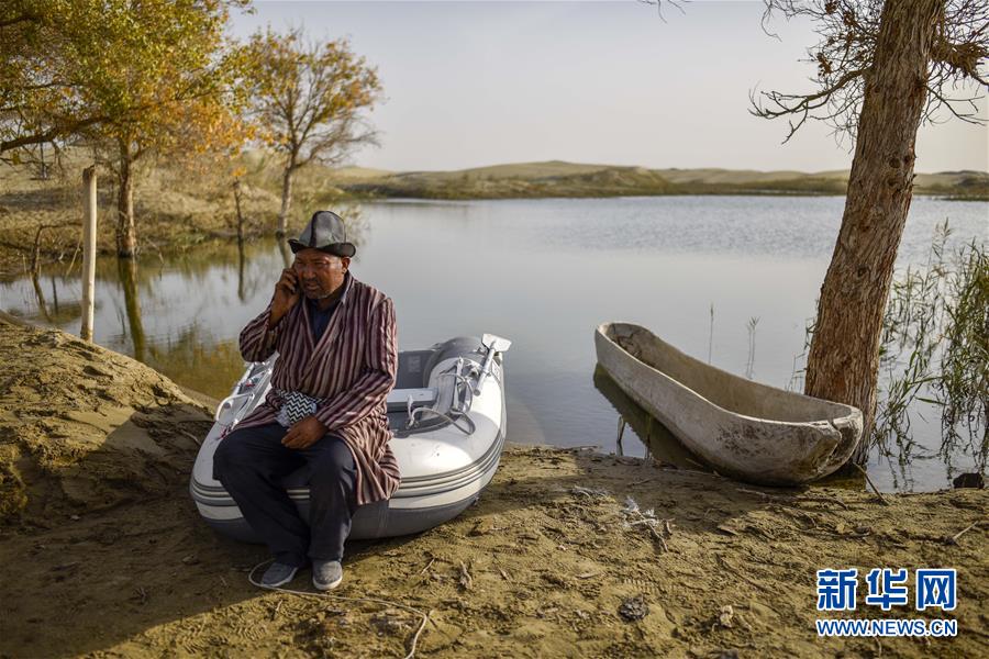 在羅布人村寨,阿木東·艾不東坐在湖邊接電話(2018年10月16日攝)。在旅游旺季,游客會(huì)通過(guò)電話提前向阿木東預(yù)約羅布烤魚。新華社記者 趙戈 攝