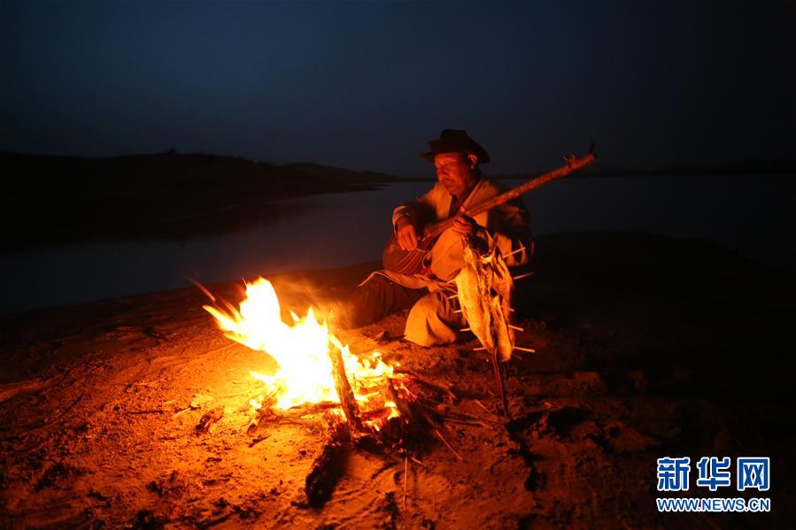 在羅布人村寨,阿木東·艾不東在沙漠里的一處海子旁彈奏樂(lè)器,等待烤魚烤熟(4月11日攝)。新華社記者 盧燁 攝