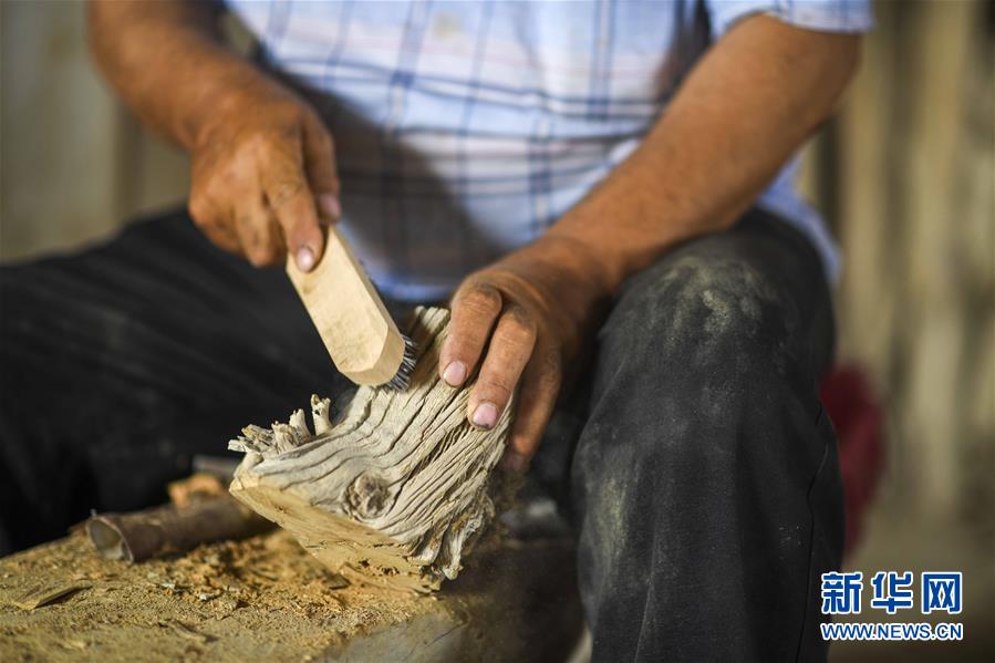 在羅布人村寨,阿木東·艾不東在家中制作胡楊筆筒(6月21日攝)。新華社記者 趙戈 攝