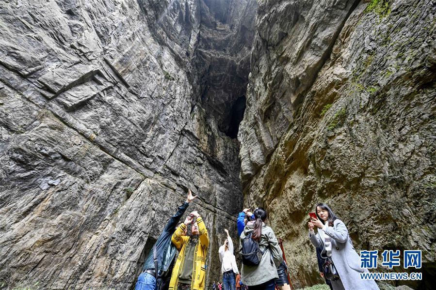 游客在天生三橋景區(qū)內的黑龍橋景點游覽(3月27日攝)。 新華社記者劉潺攝