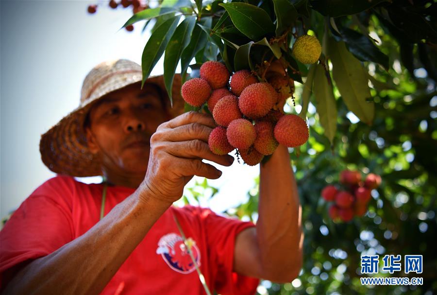 ??谑腥T坡鎮(zhèn)農(nóng)民在果園采摘荔枝(2019年5月15日攝)。 新華社記者郭程攝