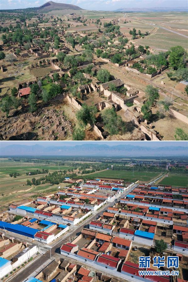 拼版照片:上圖為東坪村舊村村貌;下圖為東坪村新村村貌(6月13日無人機(jī)拍攝)。