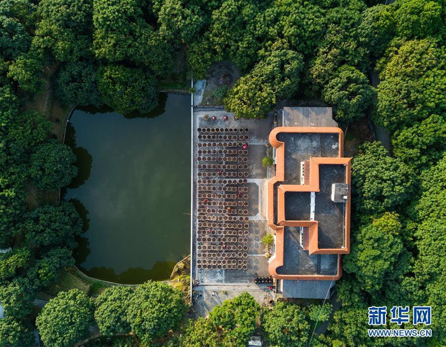 在福建省永春縣岵山鎮(zhèn)茂霞村熟地文創(chuàng)園,村民在晾曬用當(dāng)?shù)貍鹘y(tǒng)手藝制作的藥材——熟地(1月28日無人機(jī)拍攝)。 新華社記者 宋為偉 攝