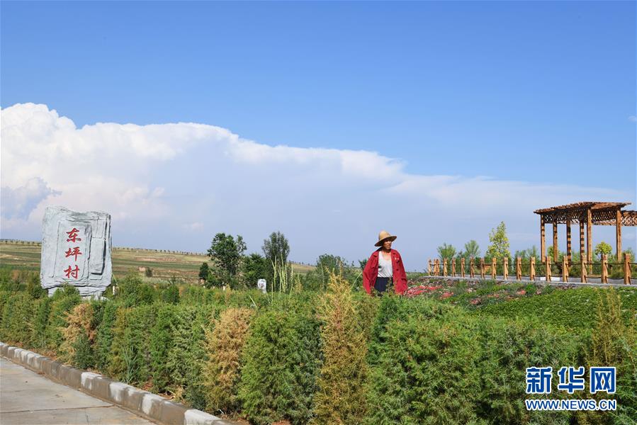 東坪村村民郭金蘭在新房的院子里澆水(6月13日攝)。 新華社記者 楊晨光 攝