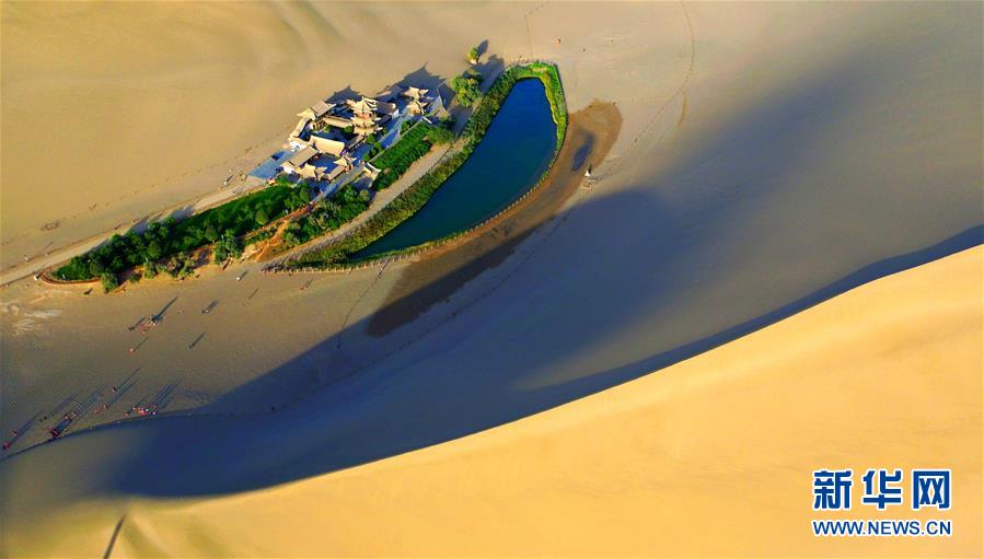 位于敦煌市鳴沙山北麓的月牙泉(2016年9月9日無人機(jī)拍攝)。新華社記者 陳斌 攝