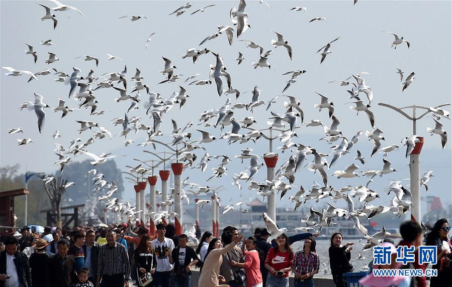 人們在昆明滇池邊與紅嘴鷗嬉戲(2016年3月15日攝)。 新華社記者 藺以光 攝