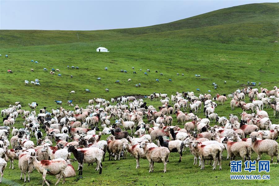 祁連山下牧場(chǎng)里的羊群(7月27日攝)。 新華社記者 吳剛 攝