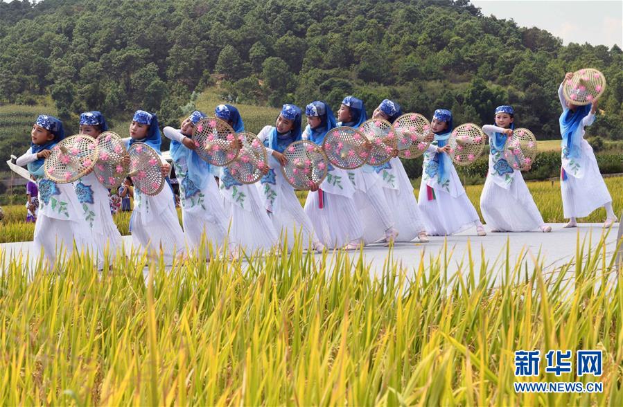 9月15日,孩子們?cè)谔镆袄锉硌菸璧浮敦S收麥田》。 金秋時(shí)節(jié),云南省尋甸回族彝族自治縣在七星鎮(zhèn)魯古村舉行慶祝豐收活動(dòng)。 新華社記者 楊宗友 攝