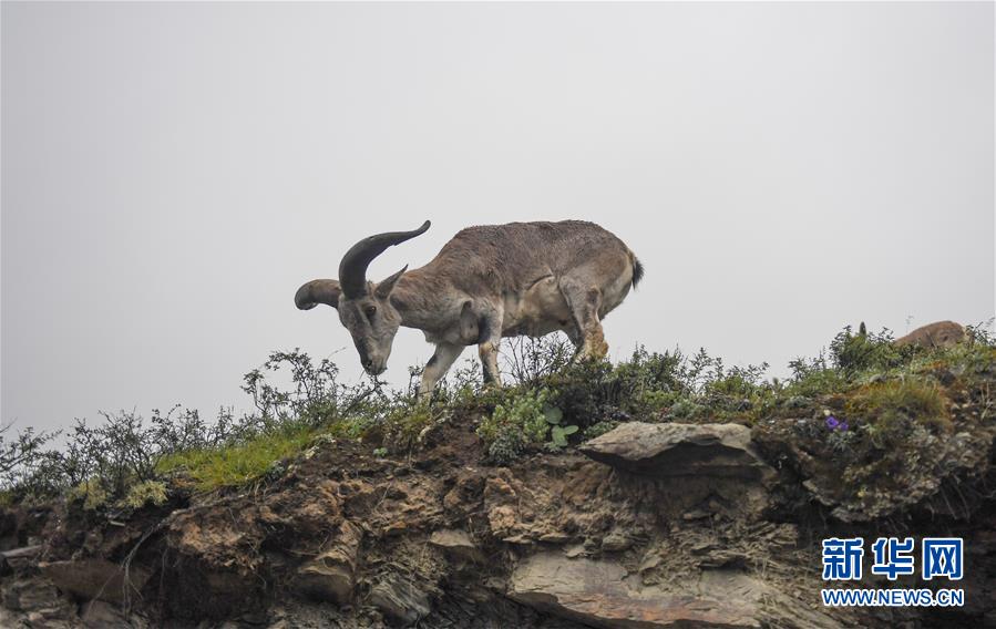 一只巖羊在西藏山南市洛扎縣色鄉(xiāng)海拔4000米左右的盤山路邊,悠閑地吃著野果青草(9月22日攝)。新華社記者 晉美多吉 攝