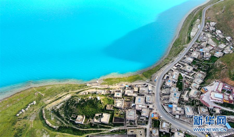 8月31日無(wú)人機(jī)拍攝的羊卓雍錯(cuò)及周邊村落。新華社記者晉美多吉攝