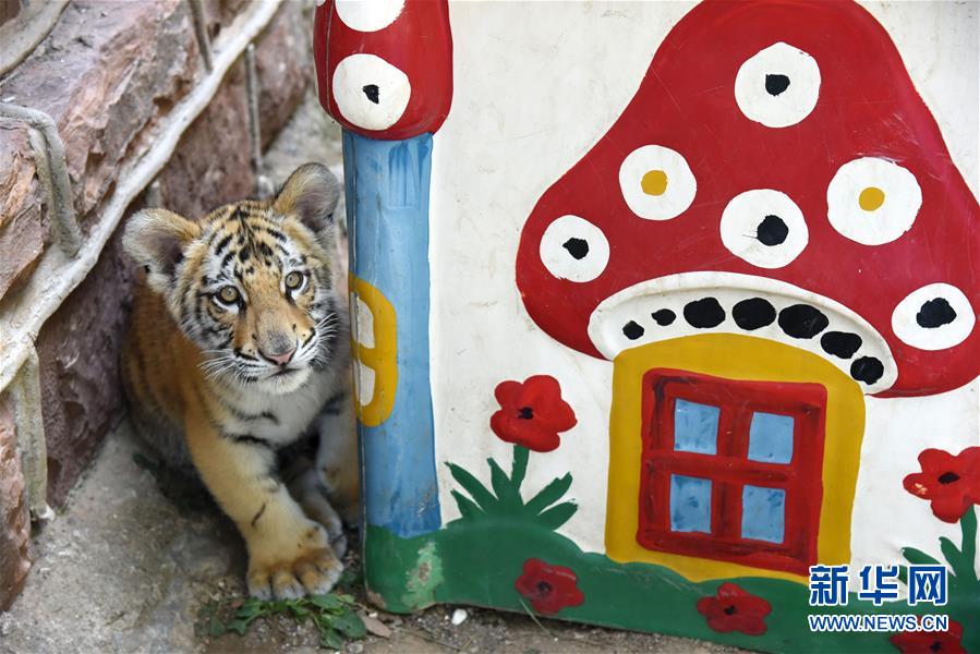9月26日,孟加拉虎寶寶“小七”在自己的小窩里“玩耍”。 新華社記者 王凱 攝