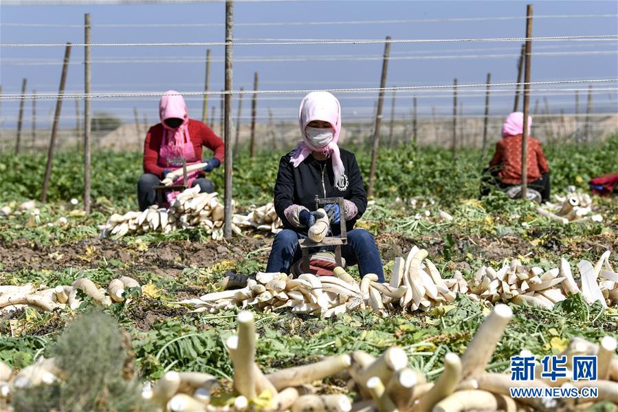 近日,寧夏吳忠市紅寺堡區(qū)馬渠生態(tài)移民安置區(qū)的7000畝蘿卜喜獲豐收,農(nóng)民在田間地頭拔蘿卜、切蘿卜、曬蘿卜,一片忙碌。 新華社記者 馮開華 攝