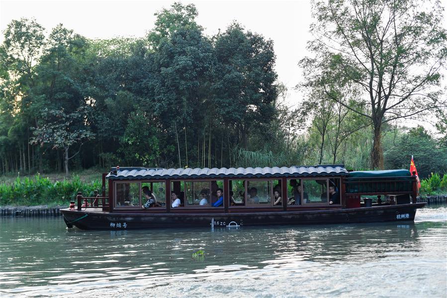 10月3日,游客在西溪國家濕地公園乘船游覽。 當日是國慶假期第三天,大批游客來到位于杭州的西溪國家濕地公園游玩,在江南詩意的環(huán)境中休閑度假。 新華社記者 黃宗治 攝