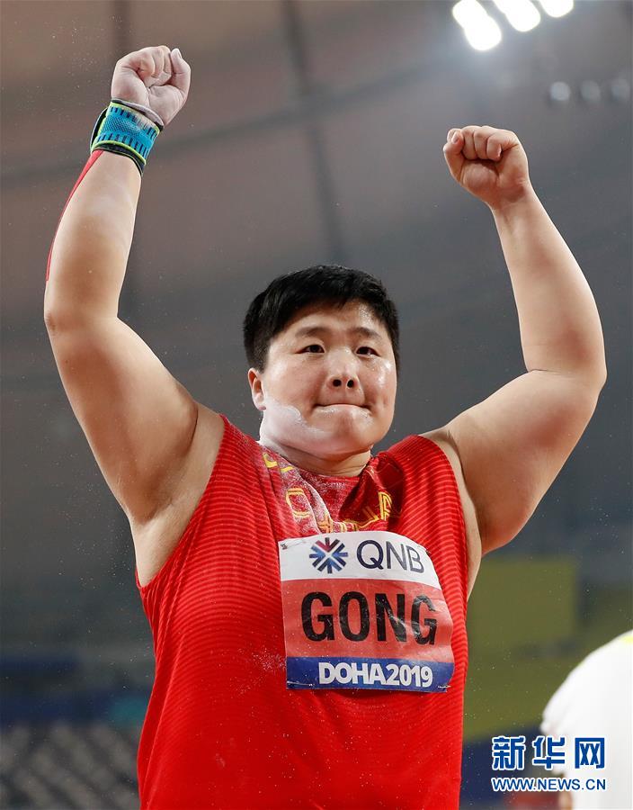 當日,在卡塔爾多哈舉行的2019國際田聯(lián)世界田徑錦標賽女子鉛球決賽中,衛(wèi)冕冠軍、中國選手鞏立姣以19米55的成績奪得冠軍。 新華社記者王麗莉攝