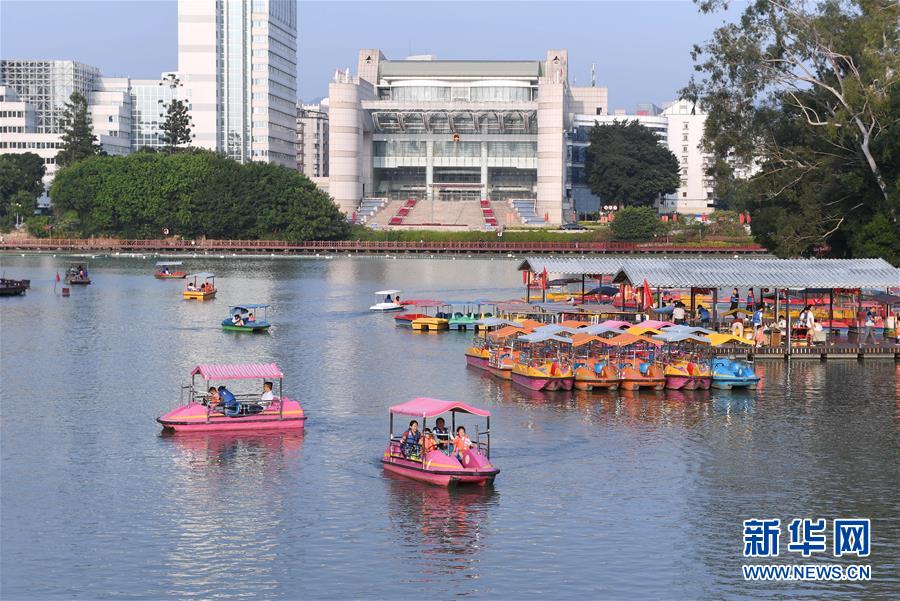 10月7日,游客在福州西湖公園乘船游玩。新華社記者林善傳攝