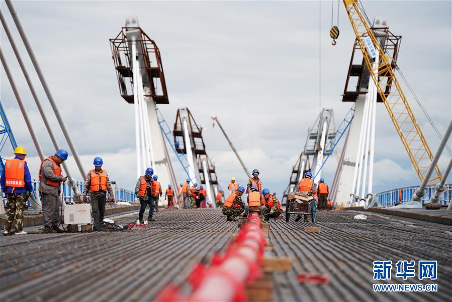 工人在大橋上進行橋面鋪裝施工作業(yè)(8月19日攝)。新華社記者 王建威 攝
