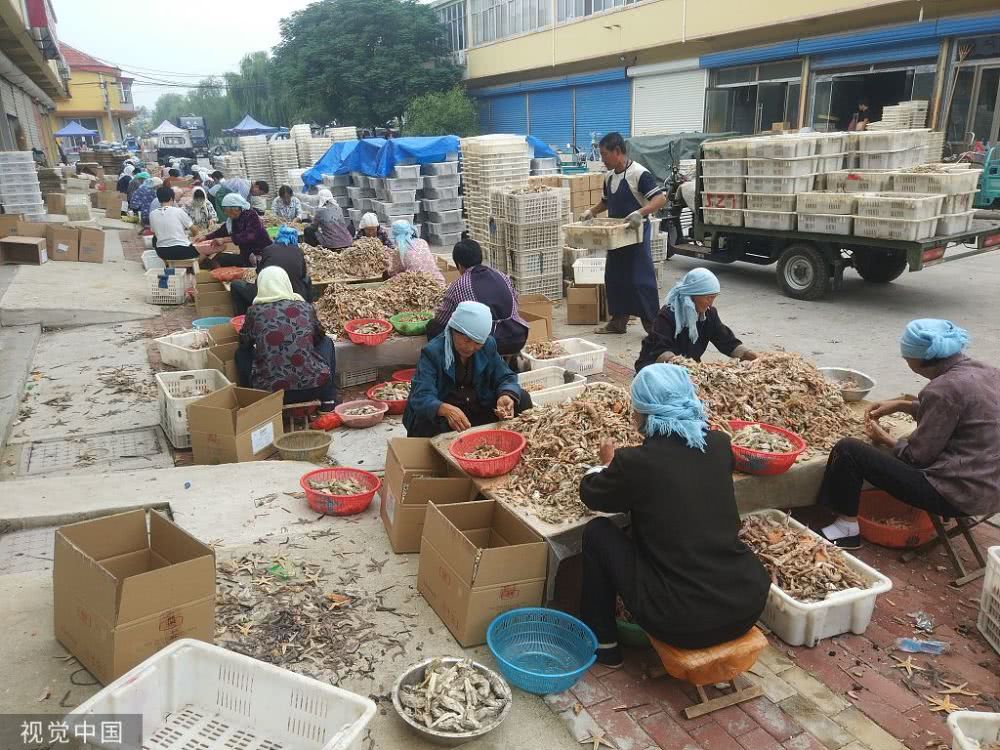 渤海灣畔海產(chǎn)豐收,成群魚蝦分揀后當街晾曬,場面賽曬糧食
