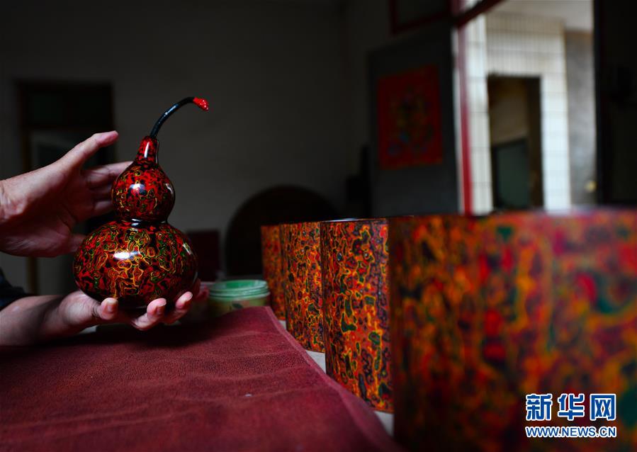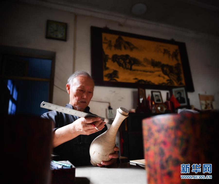 10月12日,丁國坤在家中對一件未成形的脫胎漆器進行“彩繪”工序。新華社記者胡晨歡攝