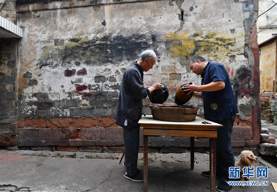10月12日,丁國坤(左)和徒弟在家門口對未成形的脫胎漆器進(jìn)行“磨顯”工序。新華社記者胡晨歡攝