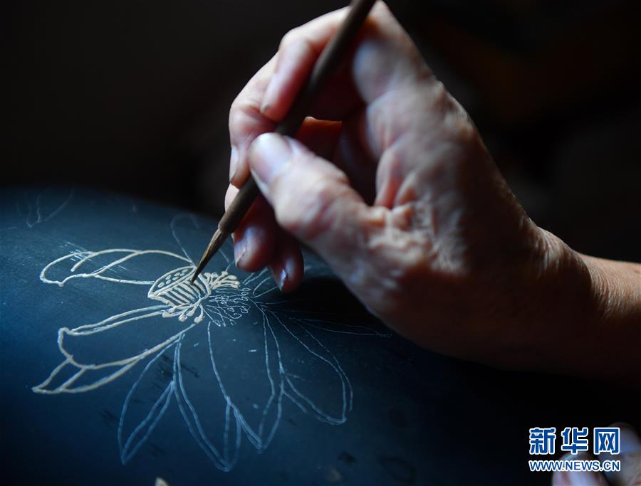 10月12日,丁國坤在家中對(duì)一件未成形的脫胎漆器進(jìn)行“彩繪”工序。新華社記者胡晨歡攝