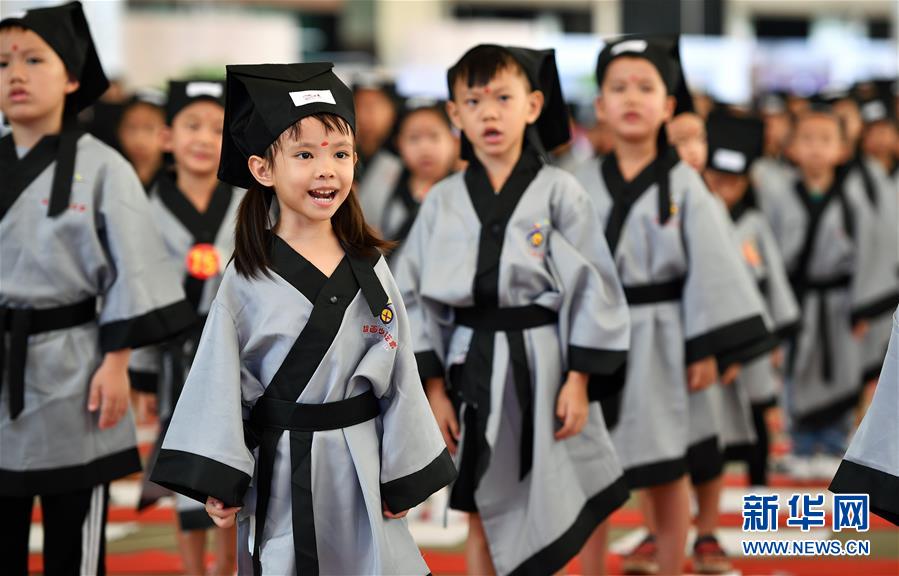 10月13日,參加儀式的小朋友在誦讀《三字經(jīng)》。當(dāng)日,??诤嬌賰核囆g(shù)中心為500名小朋友舉行“開筆禮”,通過“點(diǎn)朱砂,啟智慧”“習(xí)書法,描人字”等儀式讓孩子們體驗(yàn)中國傳統(tǒng)文化。新華社記者郭程攝