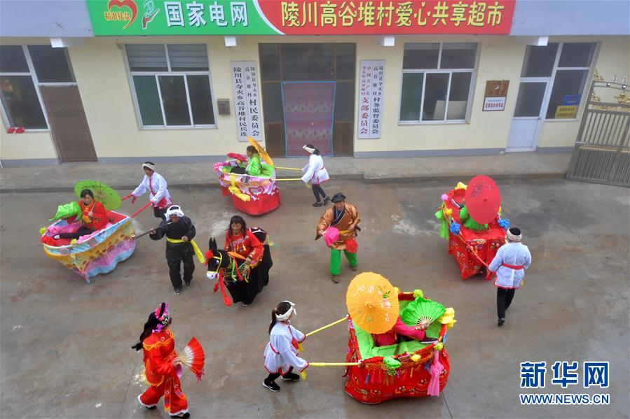 在奪火鄉(xiāng)高谷堆村,村民在排練傳統民俗節(jié)目“推小車”(10月14日攝)。 新華社記者 曹陽 攝