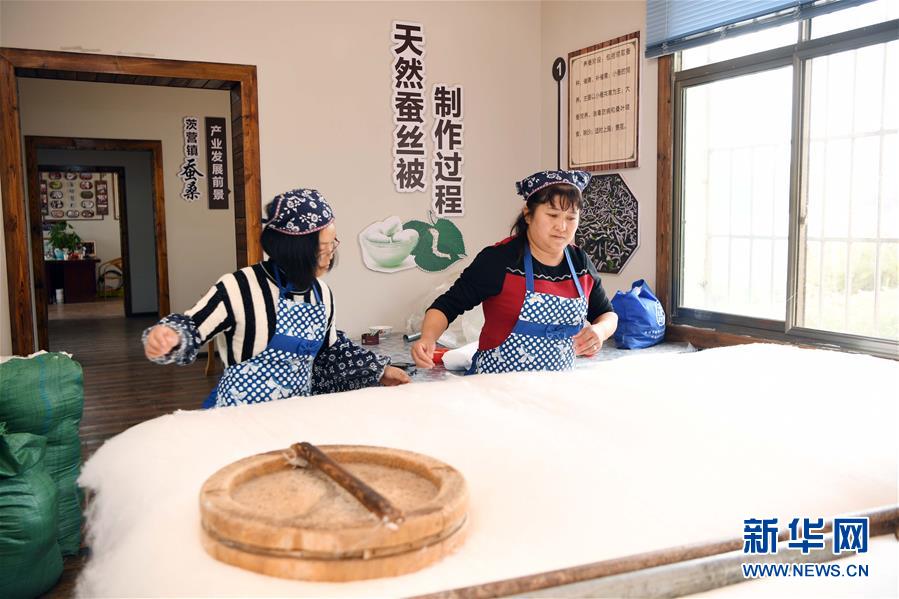 10月16日,團(tuán)結(jié)村的“巧媳婦”龔粉珍(右)和張會(huì)敏在制作蠶絲被。 新華社記者 楊宗友 攝