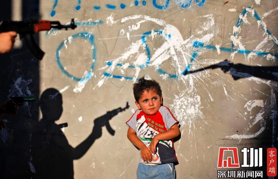 當(dāng)?shù)貢r(shí)間2009年6月16日,約旦河西岸拉馬拉,Al-Amari難民營(yíng)里,一個(gè)巴勒斯坦小男孩面對(duì)朝他舉著玩具槍的少年露出驚恐的表情。