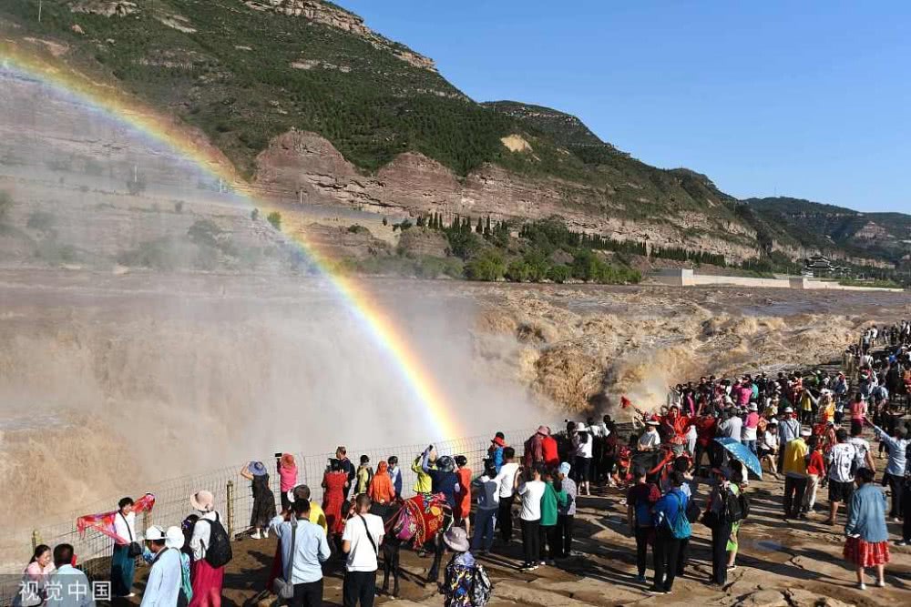 2019年8月17日,山西臨汾,游客在吉縣黃河壺口瀑布欣賞“彩虹門(mén)”景觀。